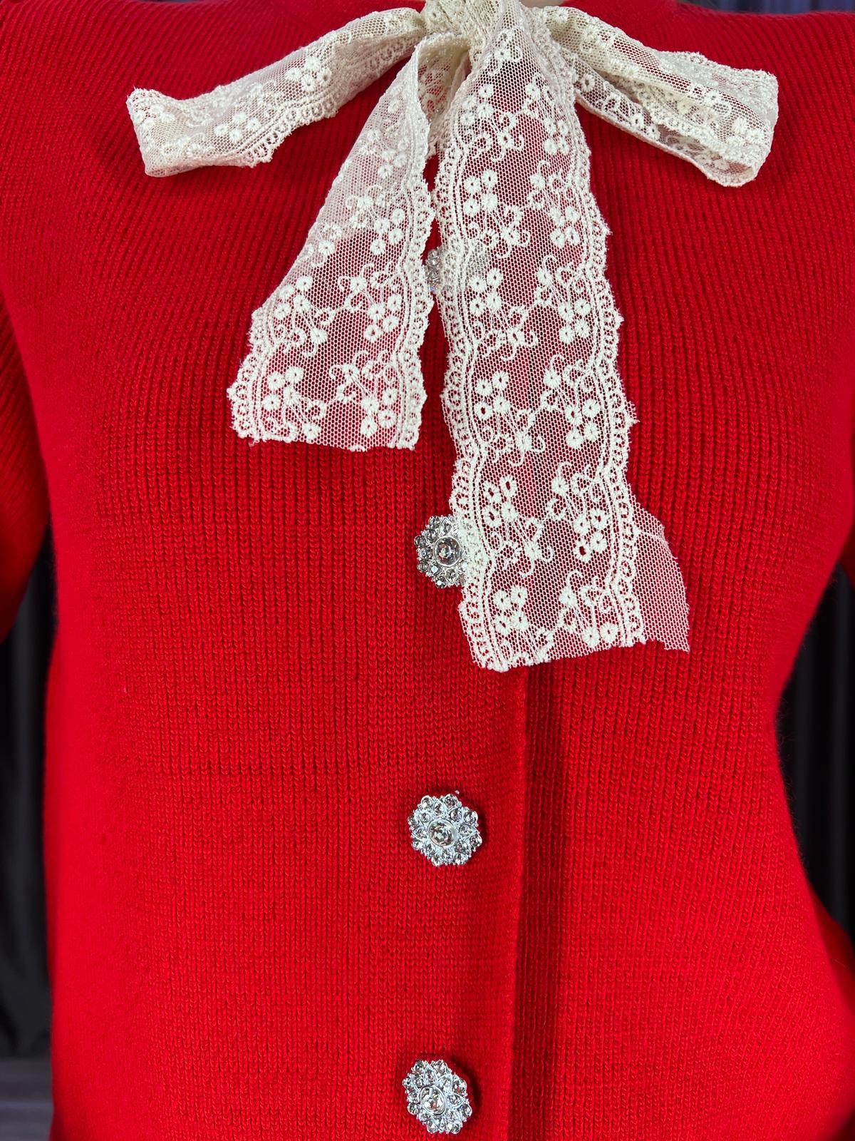 Dantel Fularlı Taşlı Düğmeli Kırmızı Hırka (BRC1026)
