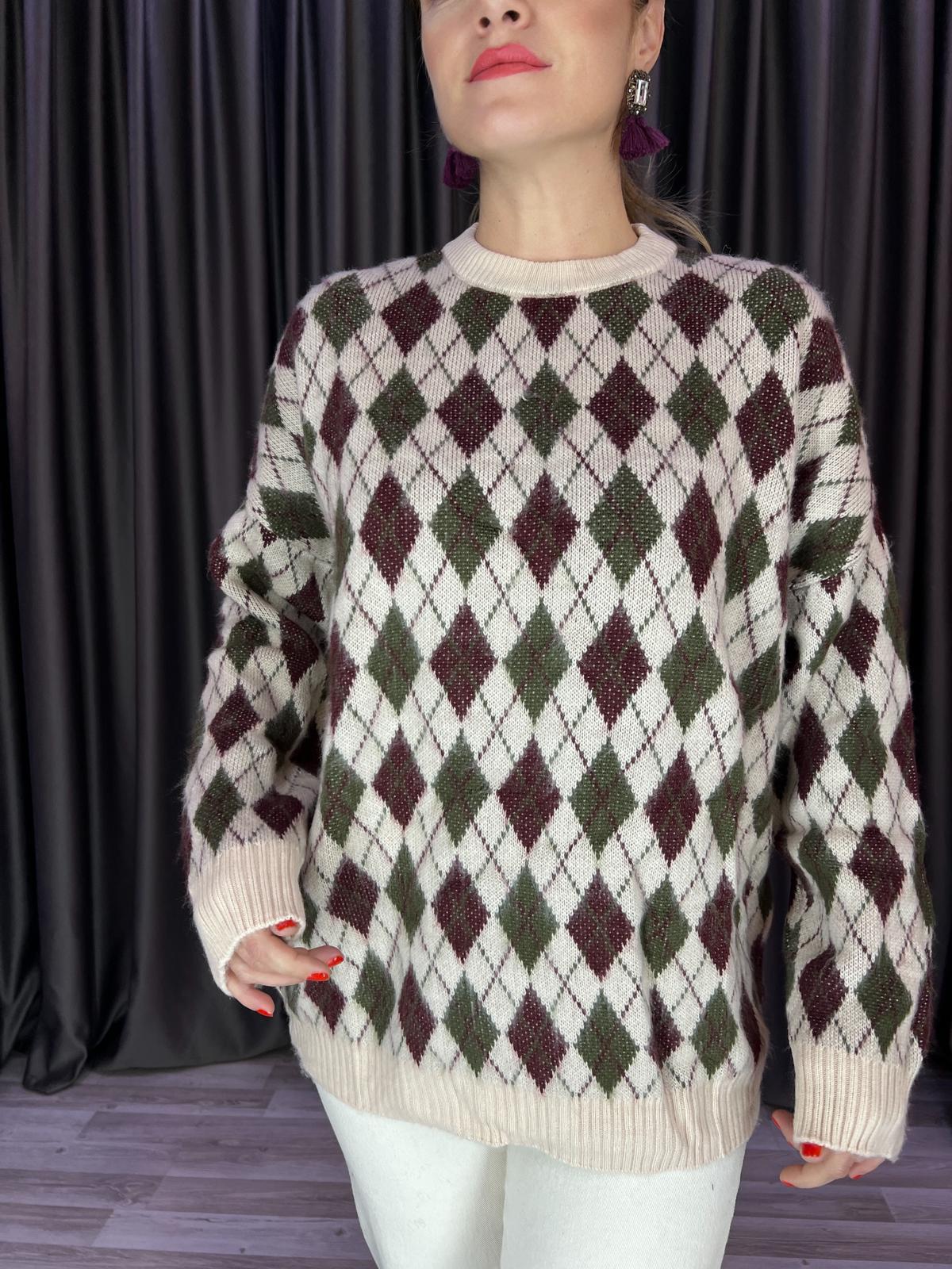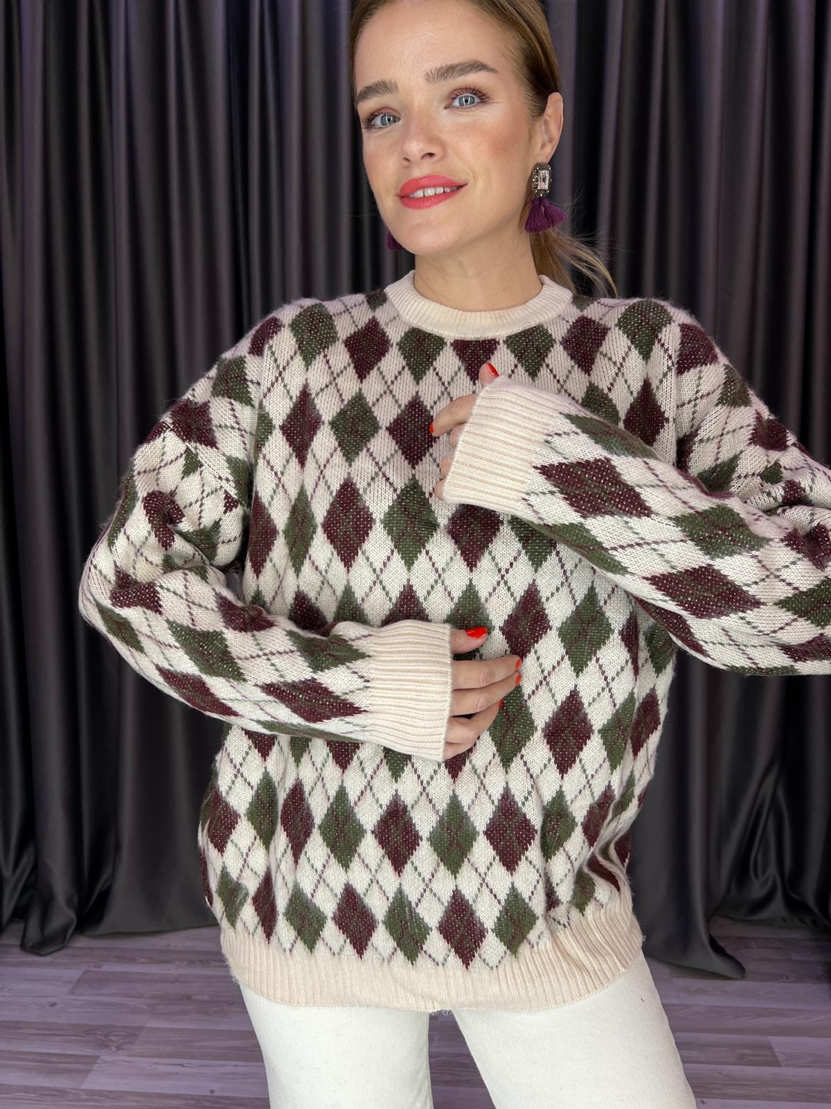 Haki Bordo Baklava Desenli Kazak (BRC794)