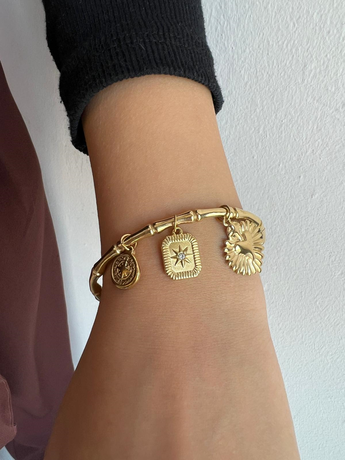 Kalp Charmlı Diktörtgen Retro Detaylı Gold Bilezik (BRCTK28)