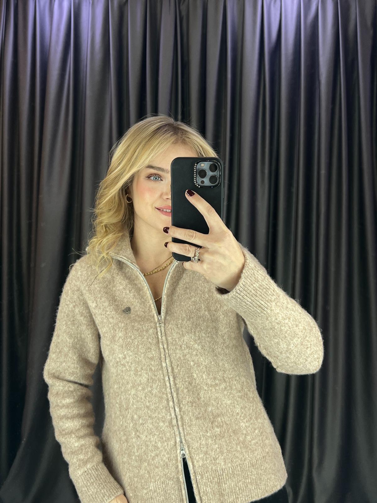 Metal Logo Alt Üst Fermuarlı Bej Hırka (BRC964)