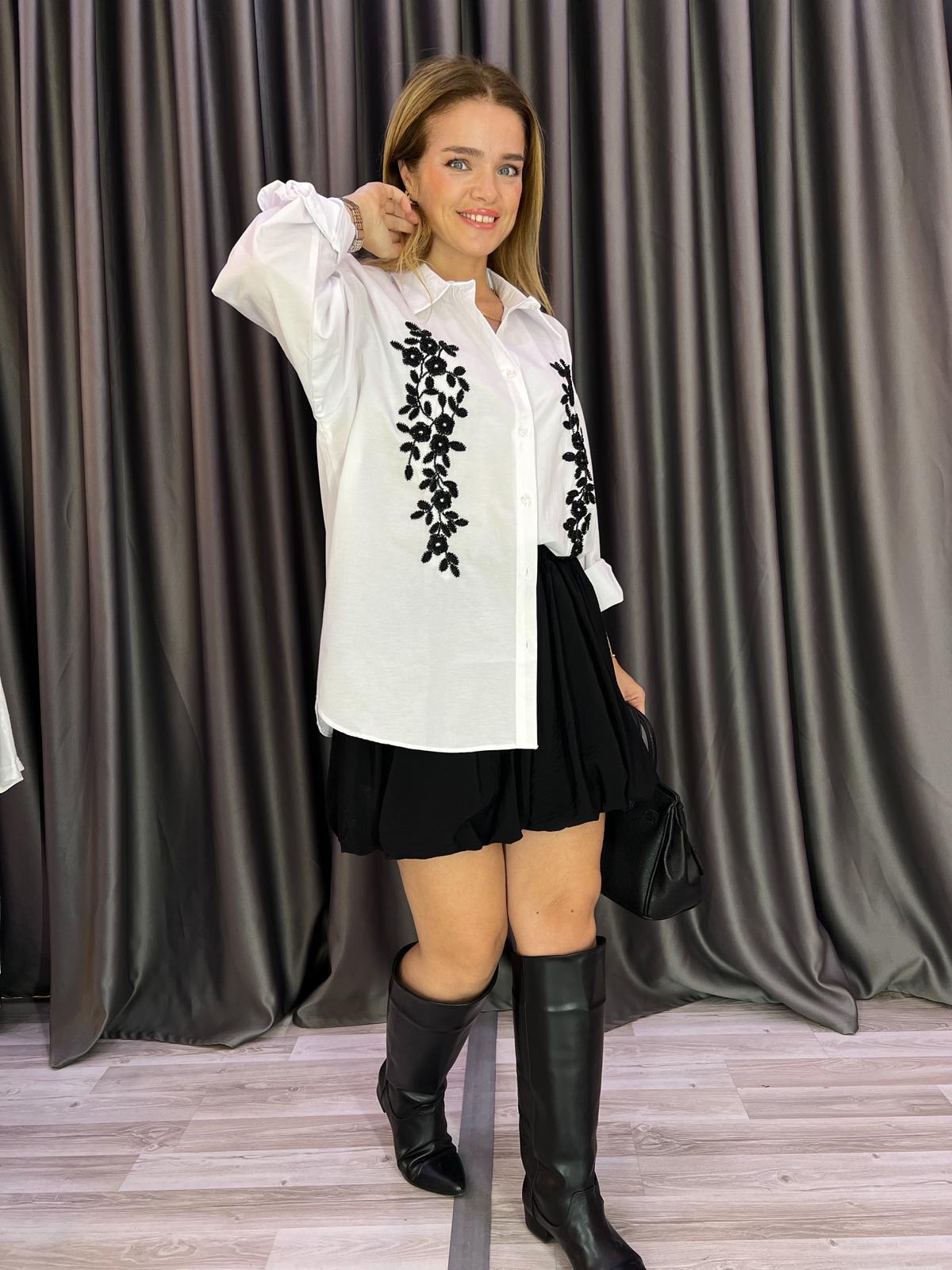 Siyah Boncuktan Çiçek İşlemeli Beyaz Poplin Gömlek Bilekleri Volan Ajur Örgü Mini Ekru Hırka