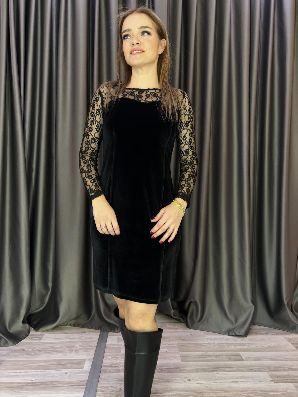 Omuz Ve Kolları Dantel Kadife Siyah Elbise (BRC939)