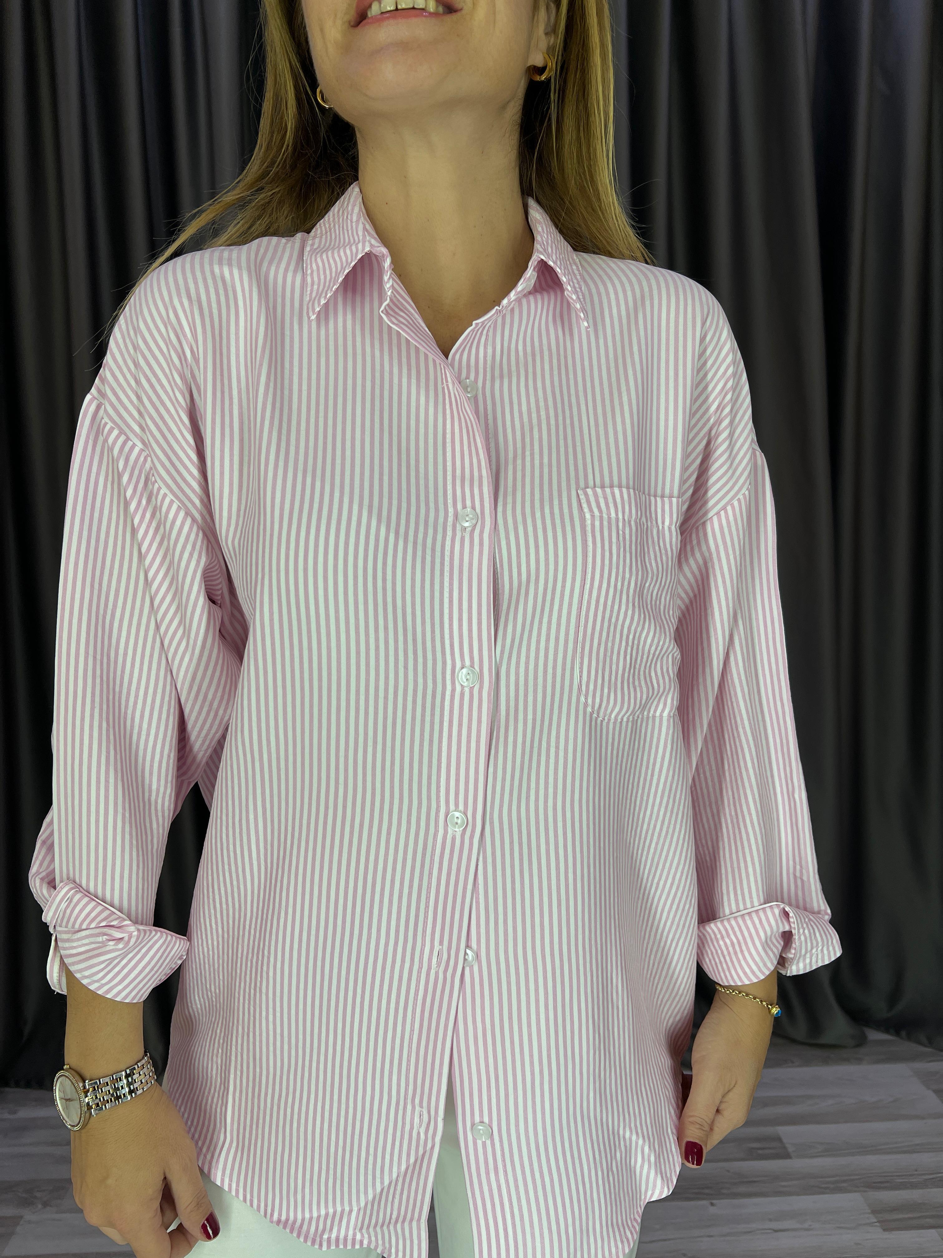 Pembe-Ekru Çizgili Cepli Bambu Gömlek (BRC741)