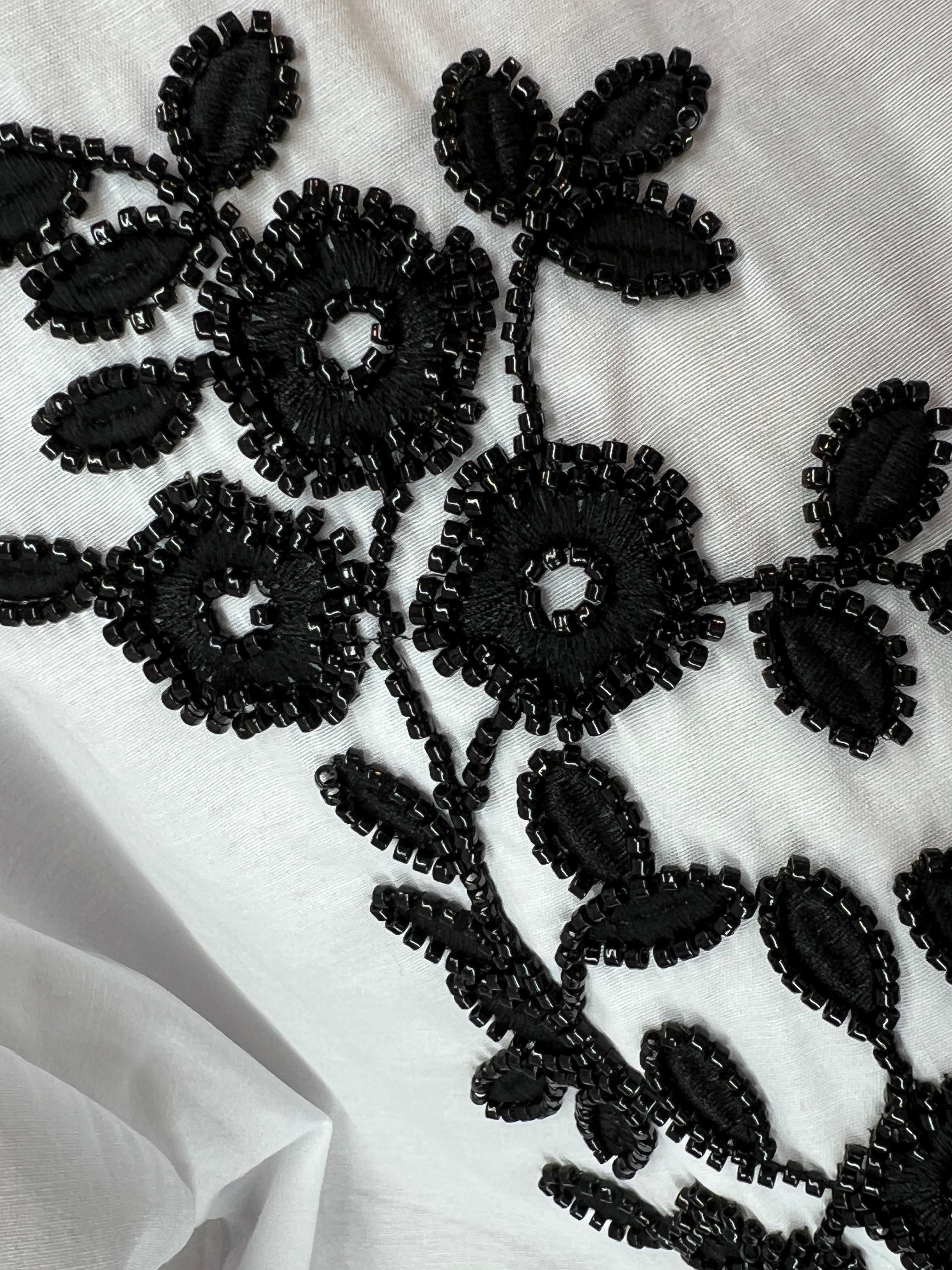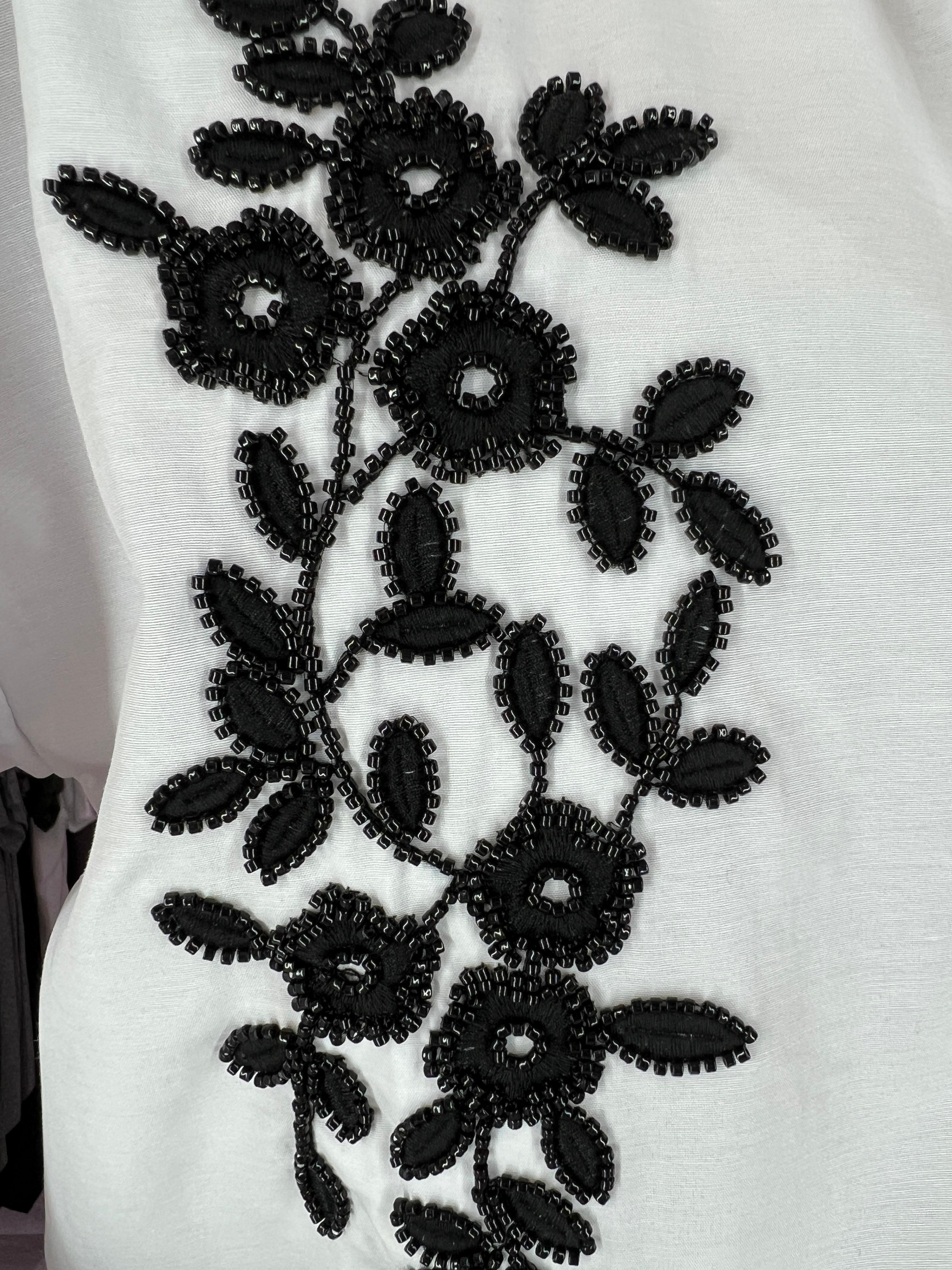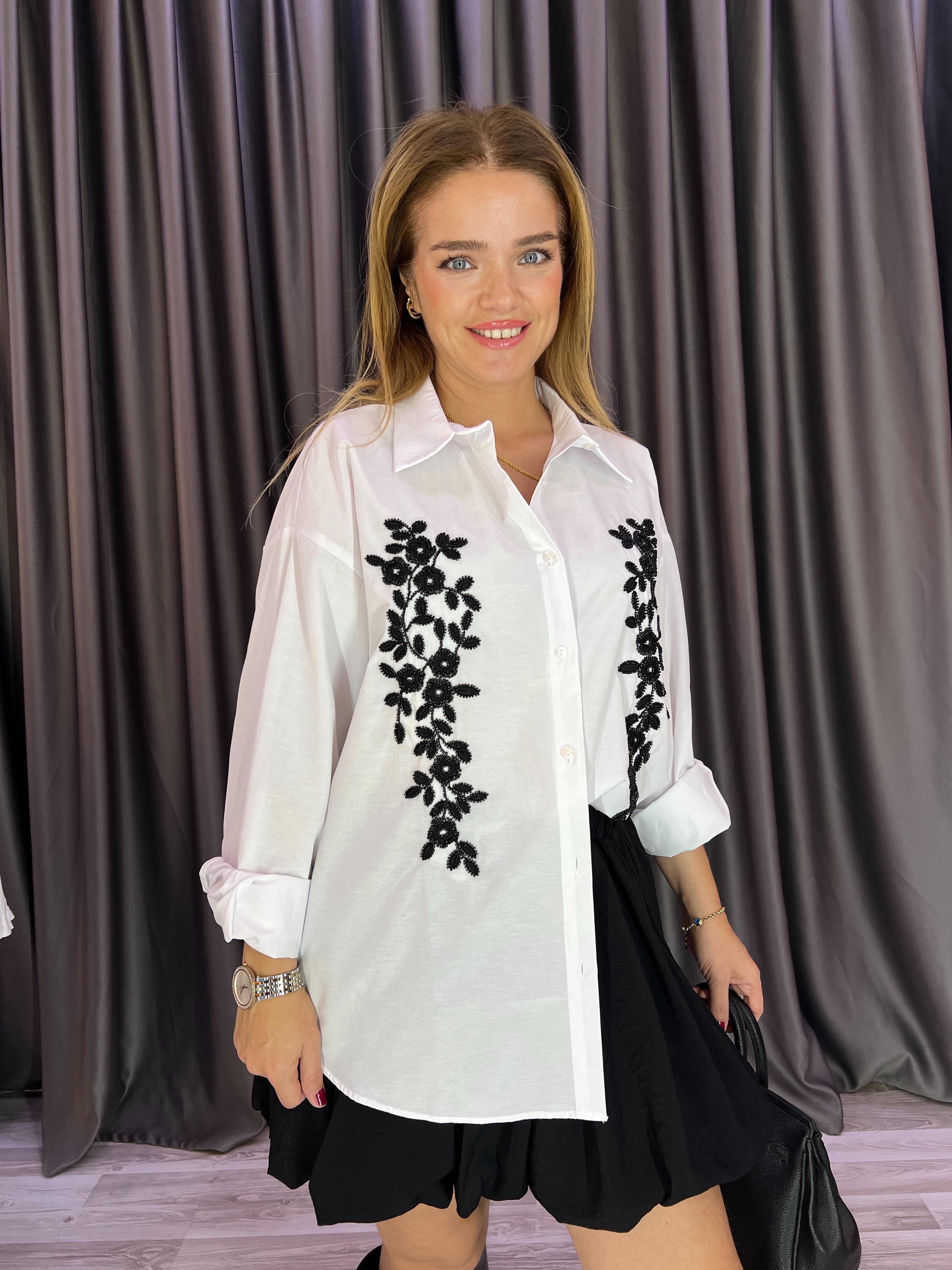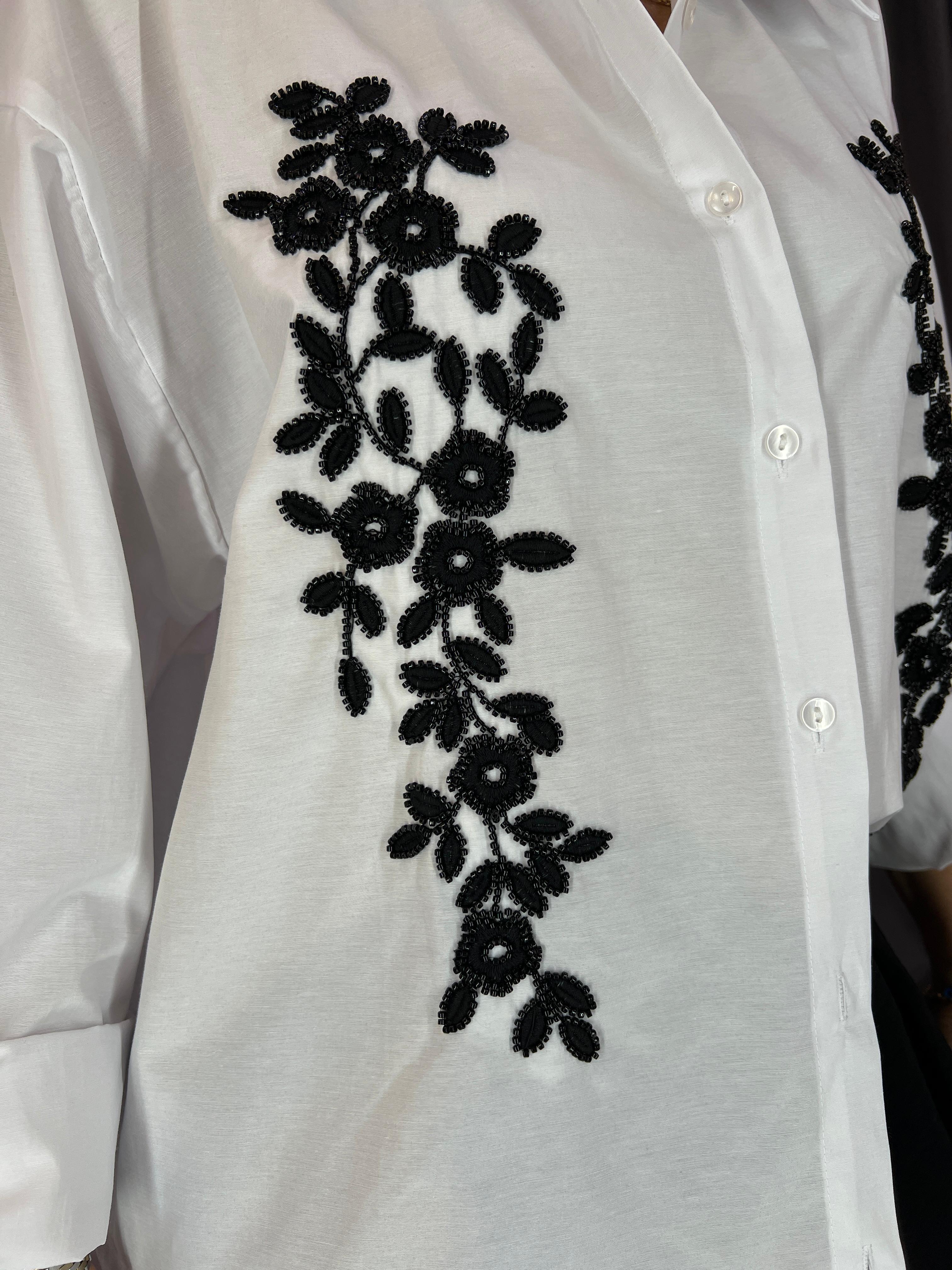 Siyah Boncuktan Çiçek İşlemeli Beyaz Poplin Gömlek (BRC739)