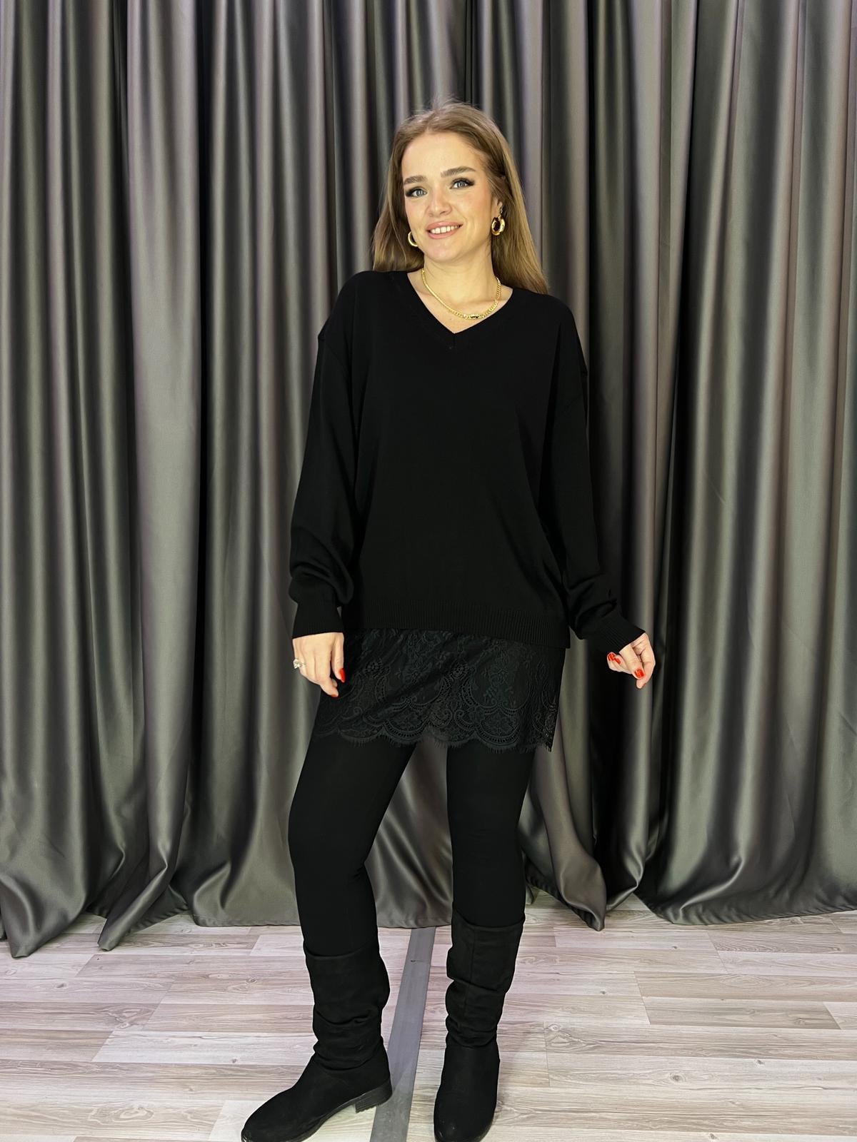 V Yaka Dantel Etek Uçlu Siyah Triko (BRC919)