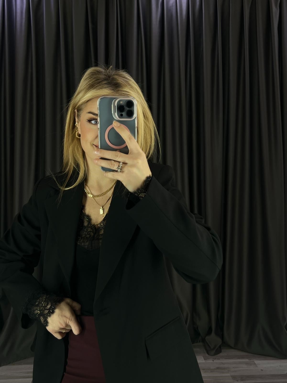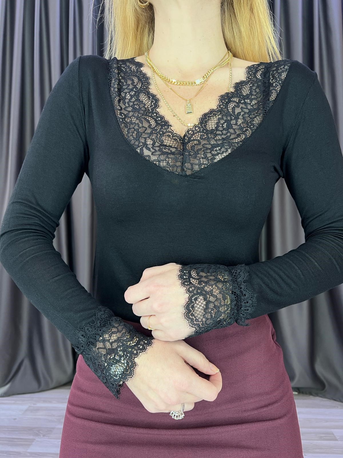 V Yaka Siyah Dantelli Kaşmir Bluz (BRC1070)